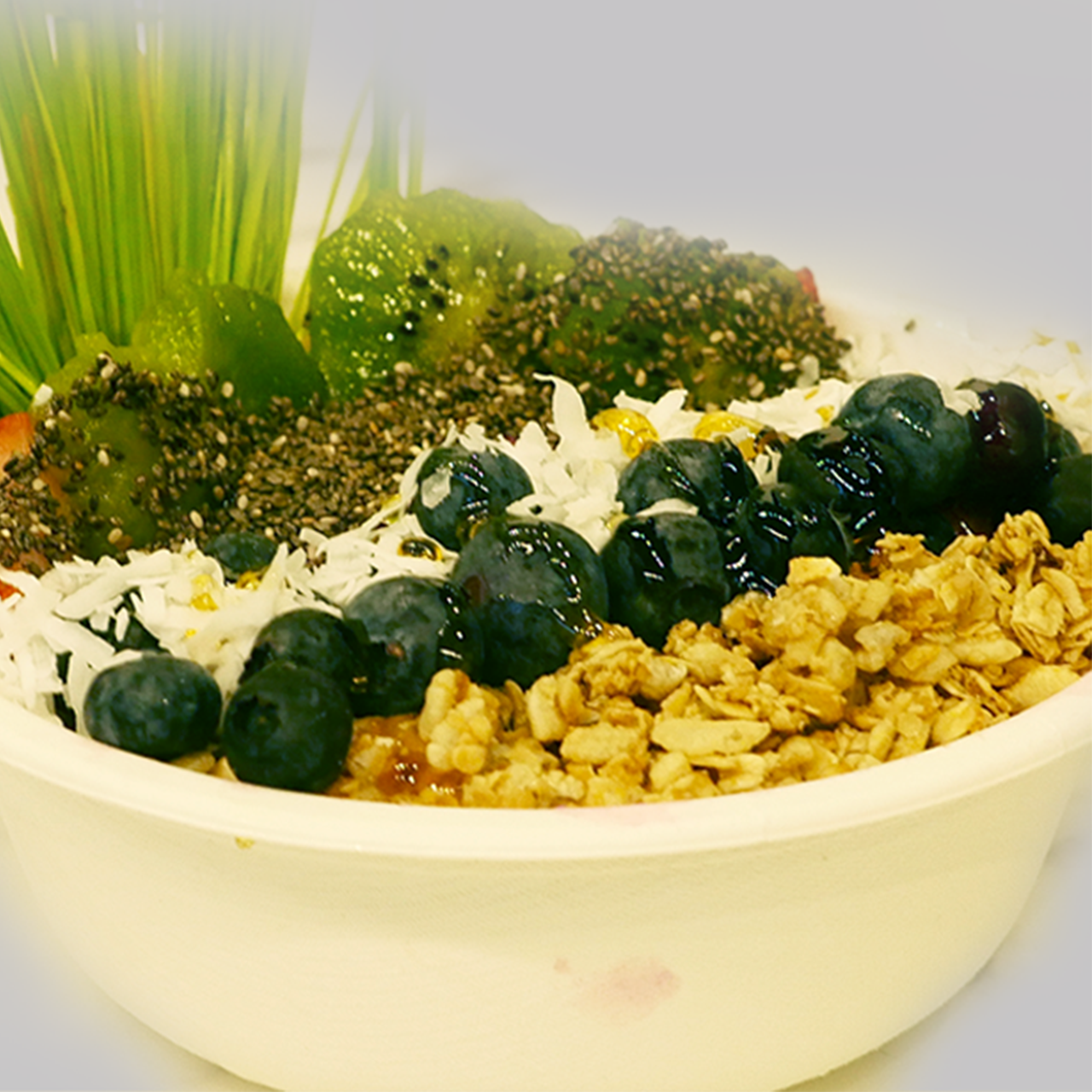 Contains: Dragonfruit, Pineapple, Mango, Banana, Coconut Water. Toppings :Granola, Kiwi, Blackberry, Strawberry, Coconut, Honey